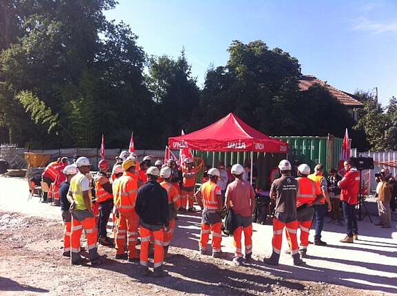 Réunis ce matin en assemblée générale, plusieurs dizaines de travailleurs du chantier de la ligne ferroviaire Cornavin-Eaux-Vives-Annemasse (CEVA) ont décidé de suspendre le travail. Ils protestent contre le plan social dérisoire concédé par la direction de l’entreprise Eaux Vives Infra SA (EVI) suite au licenciement de l’ensemble du personnel en raison de la fin des travaux.