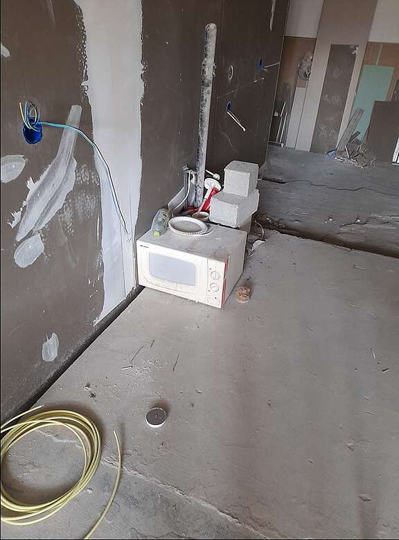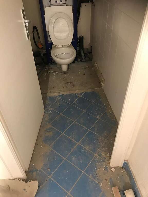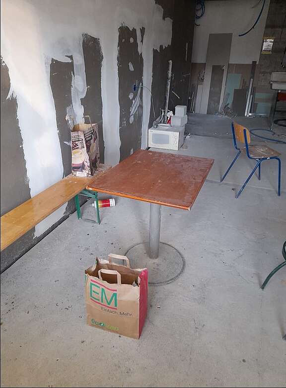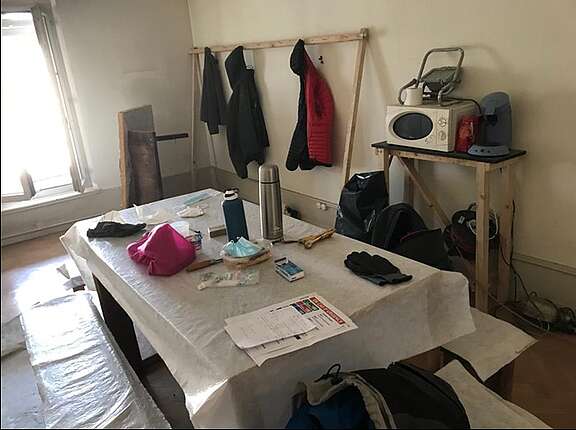 Les lieux de vie des travailleurs (lieu de repas et vestiaire) se trouvent dans un état de délabrement rarement vu auparavant: tous les corps de métier du gros œuvre, du second œuvre ou de la métallurgie du bâtiment déposent leurs affaires et leurs habits et mangent dans le même local, qui sert par ailleurs à stocker du matériel couvert de poussière (photos 1,2,4,6,7 et 8). D’autres travailleurs ne disposent même pas d’un espace où se changer et manger. Le chantier ne dispose que d’une seule toilette pour l’ensemble des ouvriers. Et celle-ci ne fait même pas l’objet d’un nettoyage régulier (photo 5).