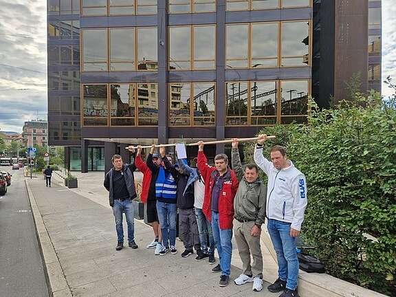 Afin d’attirer l’attention du patronat du secteur, des travailleuses et des travailleurs ont tenu, ce matin, une conférence de presse pour présenter leurs revendications et ont offert un râteau, outil indispensable dans leur travail, au président de Jardin Suisse Genève. Ce râteau possède la caractéristique intéressante de pouvoir ratisser dans les deux sens et pas en sens unique (sens patronal).