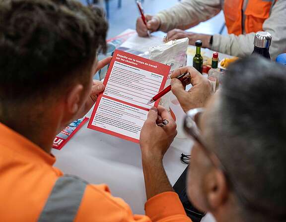 L’avis des travailleurs Les syndicalistes distribuent ensuite un questionnaire à remplir. La première partie sert à énumérer toutes les tâches non payées. La seconde partie vise à connaître les desiderata des travailleurs, pour les négociations à venir sur la convention nationale. Est-ce qu'ils préfèrent travailler huit heures par jour toute l’année, ou avoir, comme c’est le cas maintenant, des horaires variables selon les saisons? Travailler un peu moins chaque jour, ou avoir une après-midi de libre par semaine? Allonger un peu les journées de travail pour avoir droit à un jour de congé toutes les deux semaines, comme cela se fait en Autriche ?