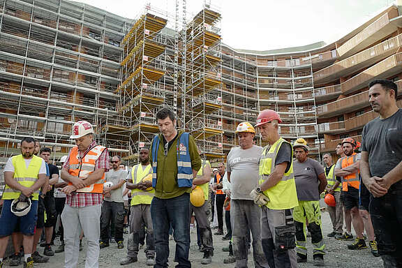 Sur un chantier de la Suva, 70 travailleurs du bâtiment se sont réunis à l’appel des syndicats Unia et SIT. Ces derniers demandent une meilleure protection des ouvriers.
