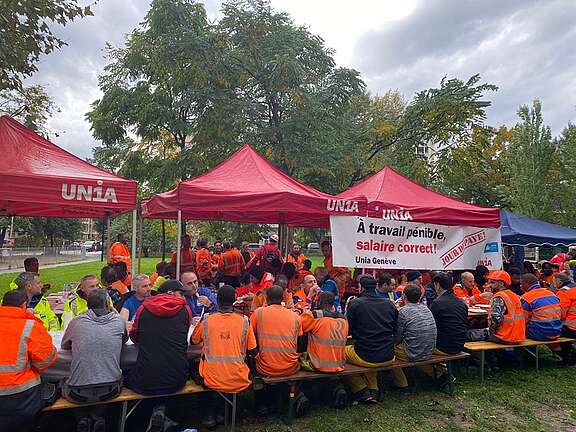 Les maçons genevois et leurs collègues dans l’ensemble de la Suisse l’ont encore en travers de la gorge. En 2023, malgré la perte de pouvoir d'achat sans précédent engendrée par l'explosion de l’inflation et l'augmentation du coût de la vie, les représentants de la société suisse des entrepreneurs (SSE) avaient refusé d'accorder aux travailleurs-euses la moindre augmentation de salaire sur le plan conventionnel. Ainsi, le 28 août dernier, alors qu’une nouvelle augmentation des prix s’annonçait pour 2025 (confirmée depuis) une délégation d’entre eux, excluant de revivre une nouvelle fois le même scénario, ont interpellé les patrons genevois en organisant une action symbolique devant les locaux de la SSE. Ils leur ont posé une question simple : combien êtes-vous prêts à mettre dans notre panier et ceux de nos collègues en 2025 ? Cliquer ici pour lire le communiqué de presse l'action A question pertinente des travailleurs, réponse de pingre et indigne de la SSE Malgré le boom incontestable de la construction, la pénurie récurrente de main-d’œuvre (due notamment à un pic d’âge élevé dans le secteur) et l’augmentation du coût de la vie, la SSE a maintenu sa position idéologique et jusqu’au-boutiste. Lors de la première séance de négociations salariales sur le plan conventionnel, elle n’a même pas daigné avancer une proposition. Ce n’est qu’à la suite de la grande manifestation nationale pour les salaires qui a vu des milliers de personnes défiler à Berne, et des premières actions de protestations sur les chantiers, qu’elle a enfin proposé une offre de 0,5 % d’augmentation de salaire – soit 30 francs en moyenne par mois. Cette proposition est inacceptable car elle ne compense même pas la moitié du renchérissement du coût de la vie et induit de facto une baisse des salaires. Action de mobilisation des maçons genevois en vue des négociations du 28 octobre 2024 Face à l’indigence de la proposition patronale et au mépris régulièrement affiché par la SSE à leur égard ces dernières années, près de 150 travailleurs du secteur principal de la construction se sont mobilisés aujourd’hui à midi à l’appel des syndicats SIT et UNIA. Provenant de différentes entreprises, ils se sont réunis pour une grillade à proximité d’un des plus grands chantiers du canton, le PAV. A cette occasion, ils ont rappelé qu’ils s’opposaient par principe aux augmentations de salaire à titre individuel, solution préconisée par le patronat dans le seul but de les diviser. Ils ont ainsi montré leur détermination à obtenir des augmentations dignes de ce nom pour tous en 2025. Ils ont insisté sur le fait que le travail sur les chantiers, de par sa grande pénibilité, est un travail collectif où la solidarité prime. A ce titre, c’est l’ensemble du personnel qui doit voir ses efforts récompensés par un partage équitable des richesses accumulées par le patronat grâce à leur travail. Ils ont conclu en appelant le patronat à se montrer à la hauteur des enjeux du secteur, et à leur montrer enfin de la reconnaissance pour leur engagement, en leur proposant une augmentation de salaire socialement juste le 28 octobre prochain. Sans cela, 2025, année de négociations de la CN, risque d’être particulièrement chaude et pas seulement pendant les mois d’été !